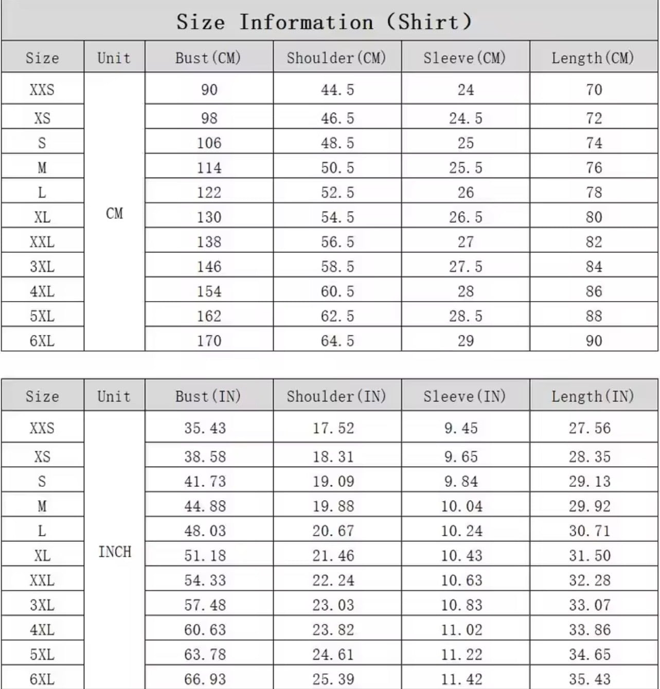 サイズはXXS〜6XLまで。
